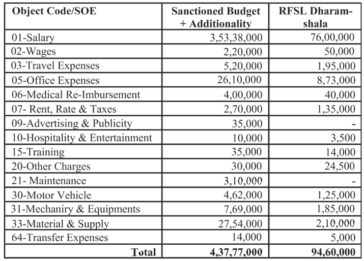 | Funds in the department are received from the State Government and in the form of grants from the government of India. The government has sanctioned plan and non plan budget under different budget heads. However, there was shortfall in some budget heads. Accordingly, the matter regarding additional budget requirements was pursued at different levels and got sanctioned additional budget in plan and nonplan budget head to the tune of Rs. 81,55,000 to complete the ongoing construction work of RFSL, Mandi and to bring down pendency in the DNA division and Cyber cases. And that enabled the institution to complete the tasks in hand. |